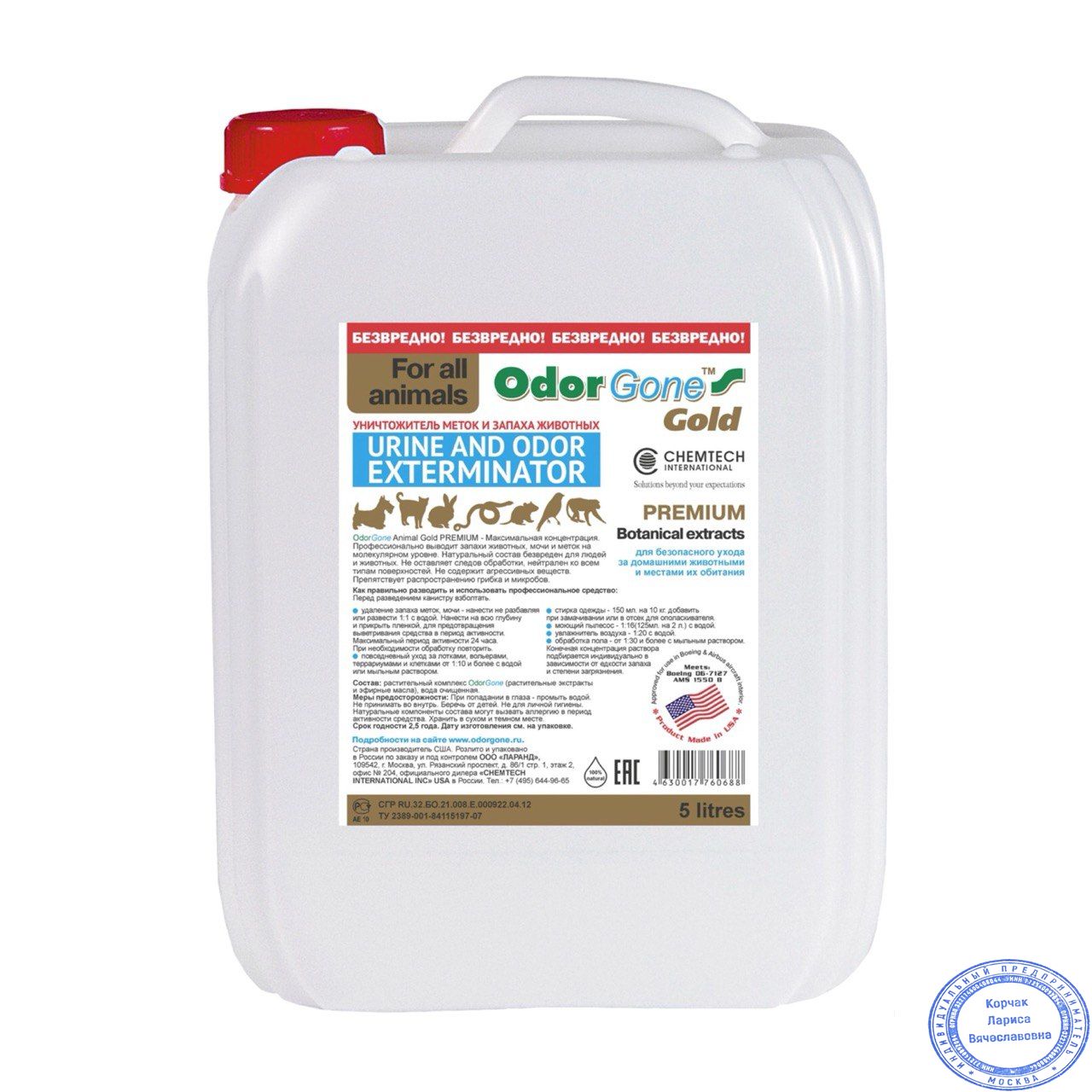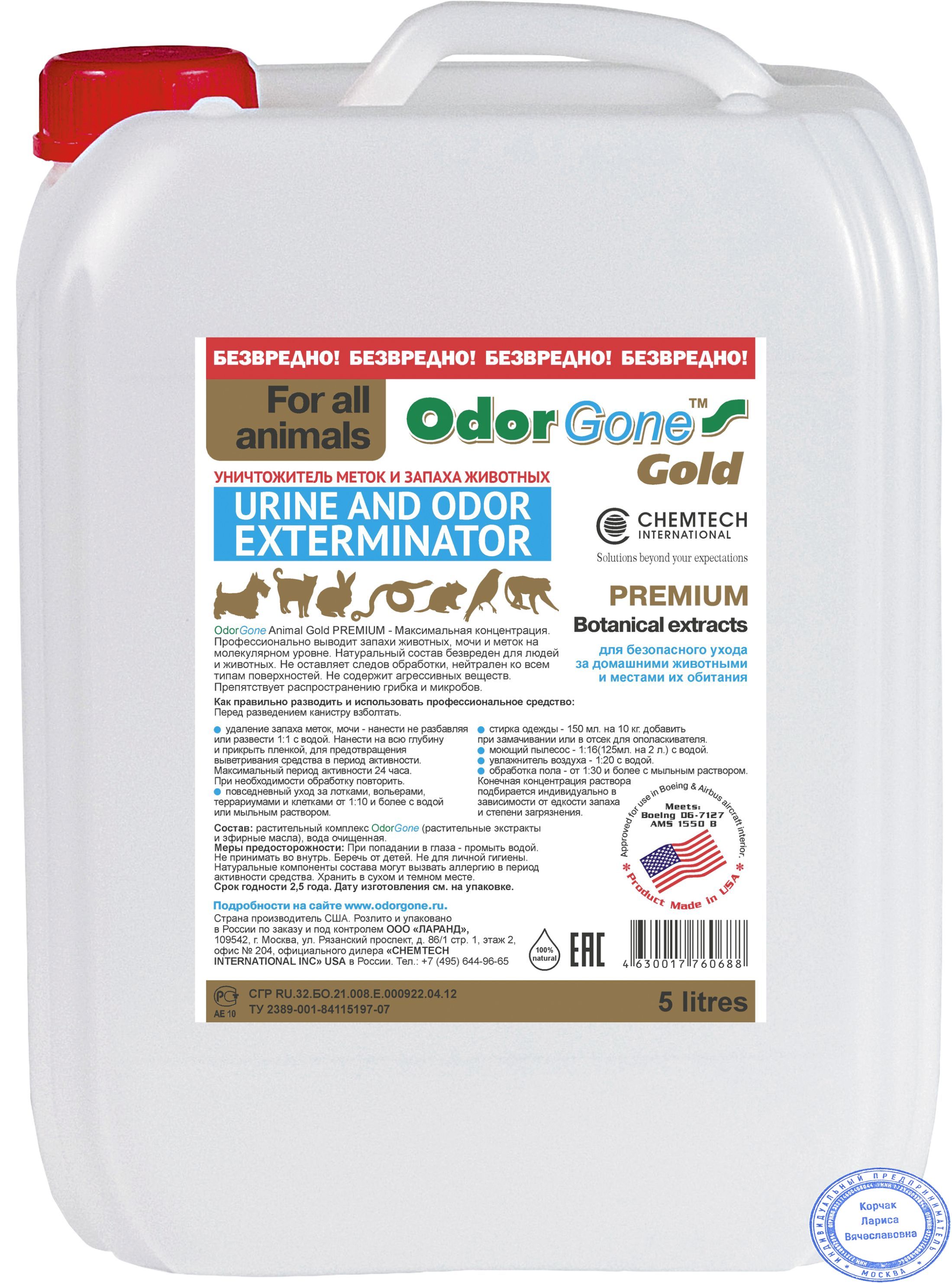 OdorGone Animal GOLD - Это уникальный для российского рынка, безопасный продукт, который профессионально выводит любой запах животного происхождения, а также удаляет вредные примеси, аллергены из воздуха и с поверхностей, обладает противогрибковыми и антибактериальными свойствами.